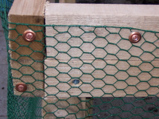 An der Außenseite wird der Draht noch einmal mit Beton mit der Betonsohle verbunden. So kann wirklich keiner rein und keiner raus. Dann wird wieder Erde auf den Beton geschüttet und festgetreten. Zum Schluss wird auch oben Draht gespannt und festgeschraubt. Hier kann man natürlich auch Holz nehmen, um einen Regenschutz zu bauen. Da bei uns aber der Rasen die Sonne braucht, haben wir uns für Draht entschieden.